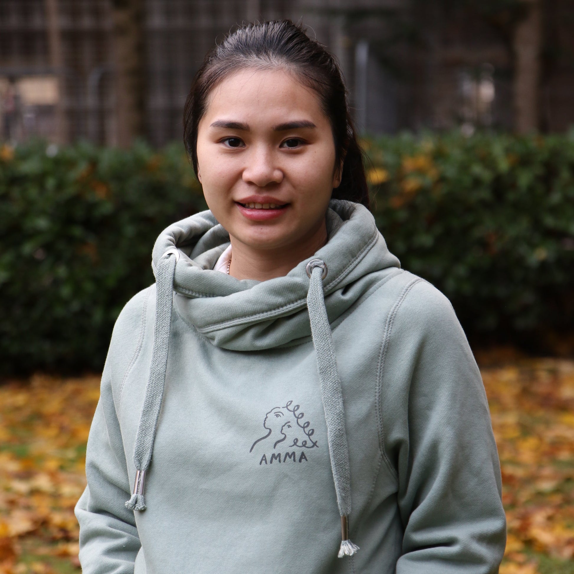 The soft fleece lining and classic zip-up design make it perfect for layering on cooler days, while its thoughtful details reflect Amma’s commitment to care and community.